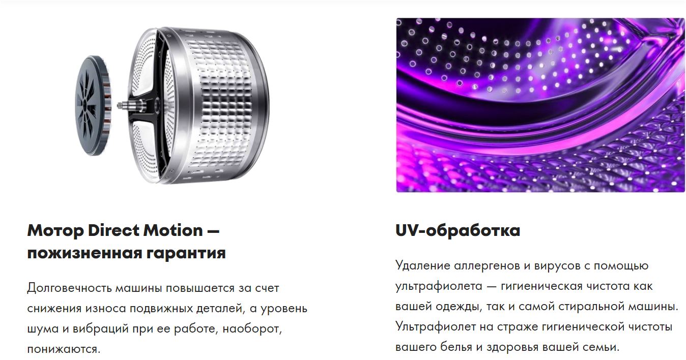 Модель принадлежит серии Color&Touch, центральный элемент дизайна — цветной LED-дисплей, с иконками 14 программ стирки для любых, в том числе нетривиальных сценариев. Например, режим «Освежить» подойдет для вещей, которым стирка в воде противопоказана, а обработка ультрафиолетом поможет удалить бактерии на одежде. Опционально можно активировать отложенный старт, паровые функции и Antistain — режим деликатно выведет пятна от косметики, вина и других загрязнений.